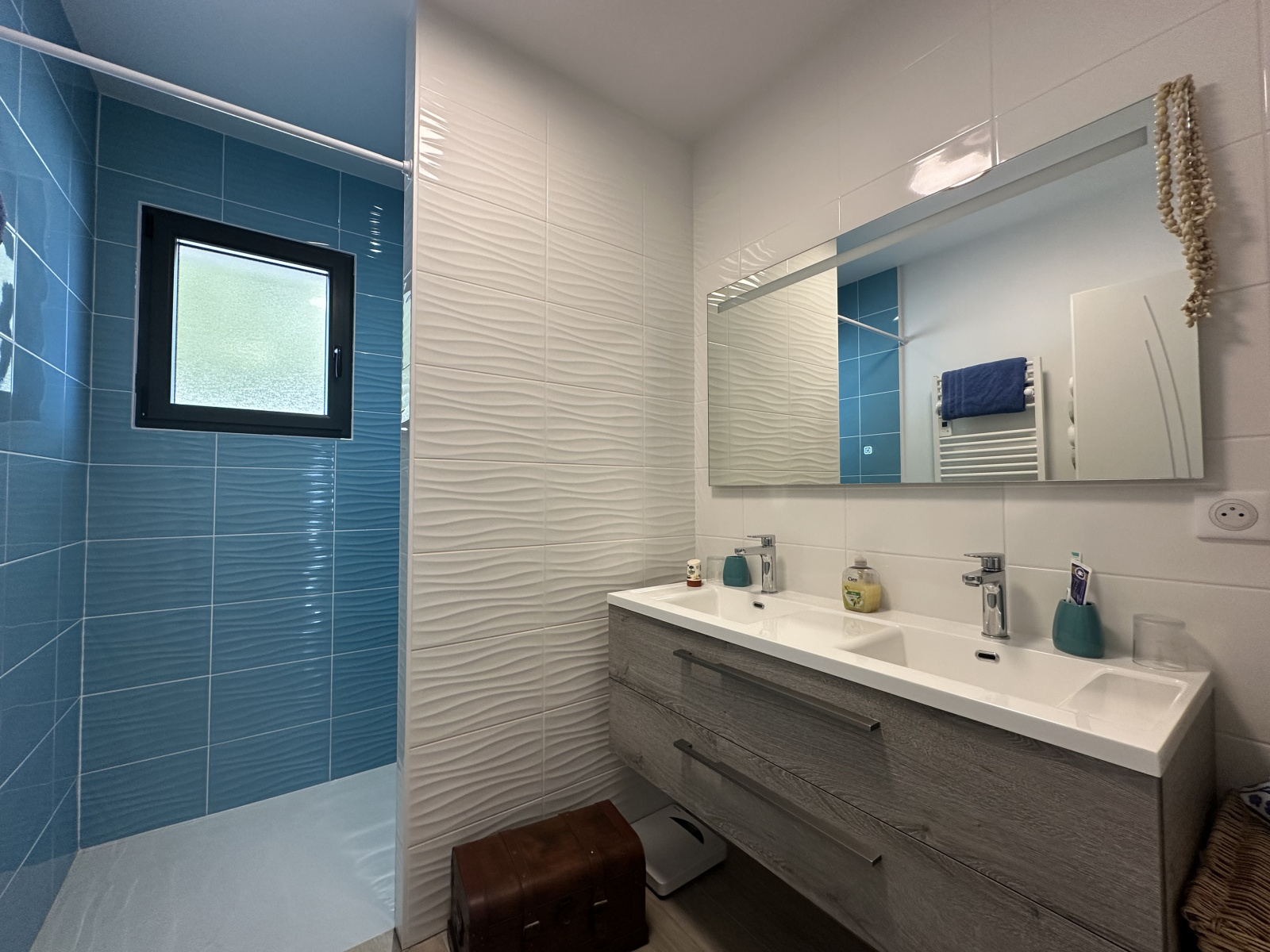 Les extérieurs sont intimistes et sans aucun vis à vis. Belle prestations, chauffage au sol, volets électriques, menuiseries en aluminium et matériaux de qualité sont les atouts de cette maison.