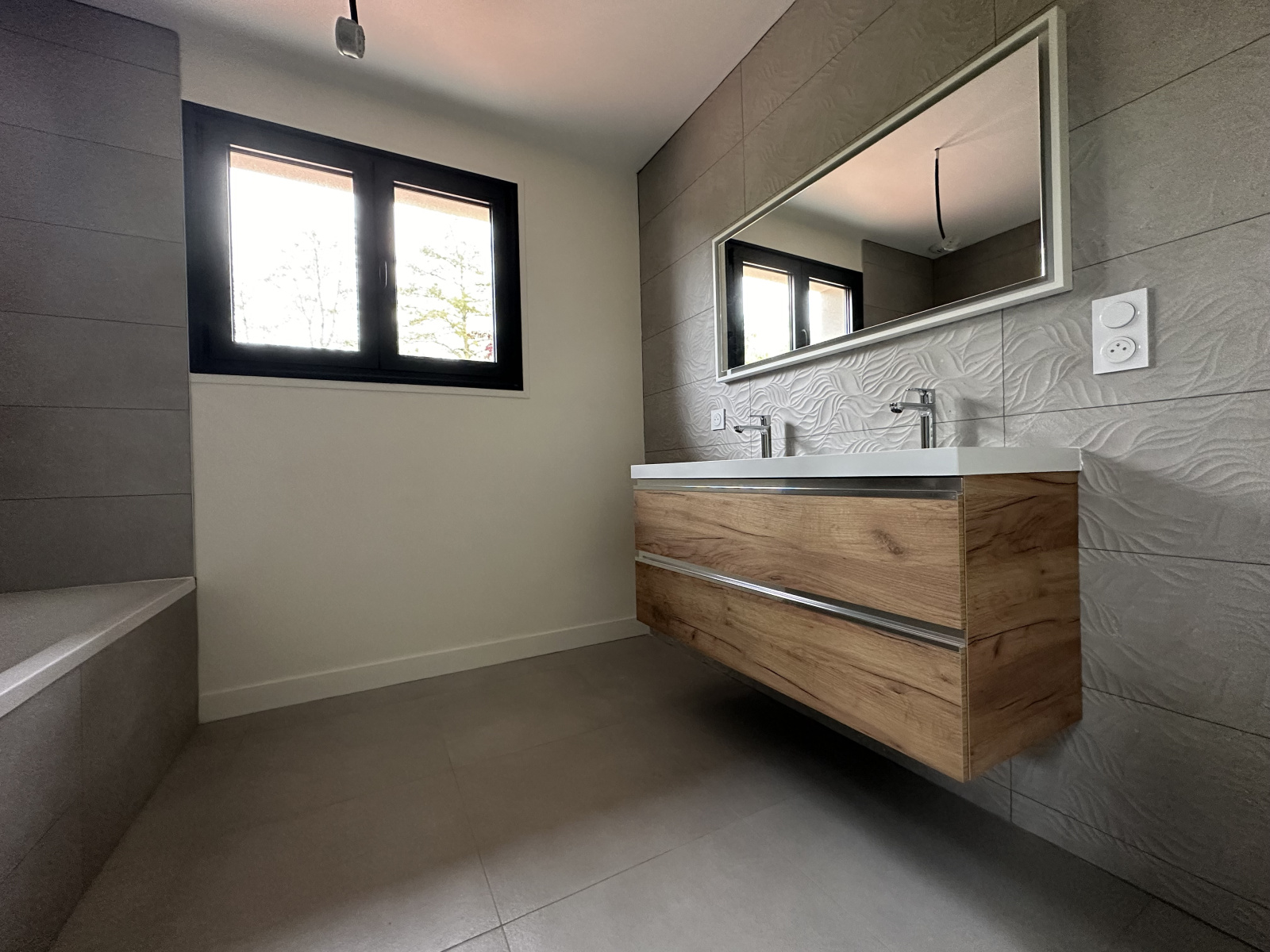 Sur le premier niveau, vous y trouverez une chambre parentale, une chambre d'invité avec son point d'eau, une buanderie, un toilette, et un superbe espace de vie s'ouvrant sur sa terrasse d'environ 100m² avec une vue dégagée sur un espace vert.