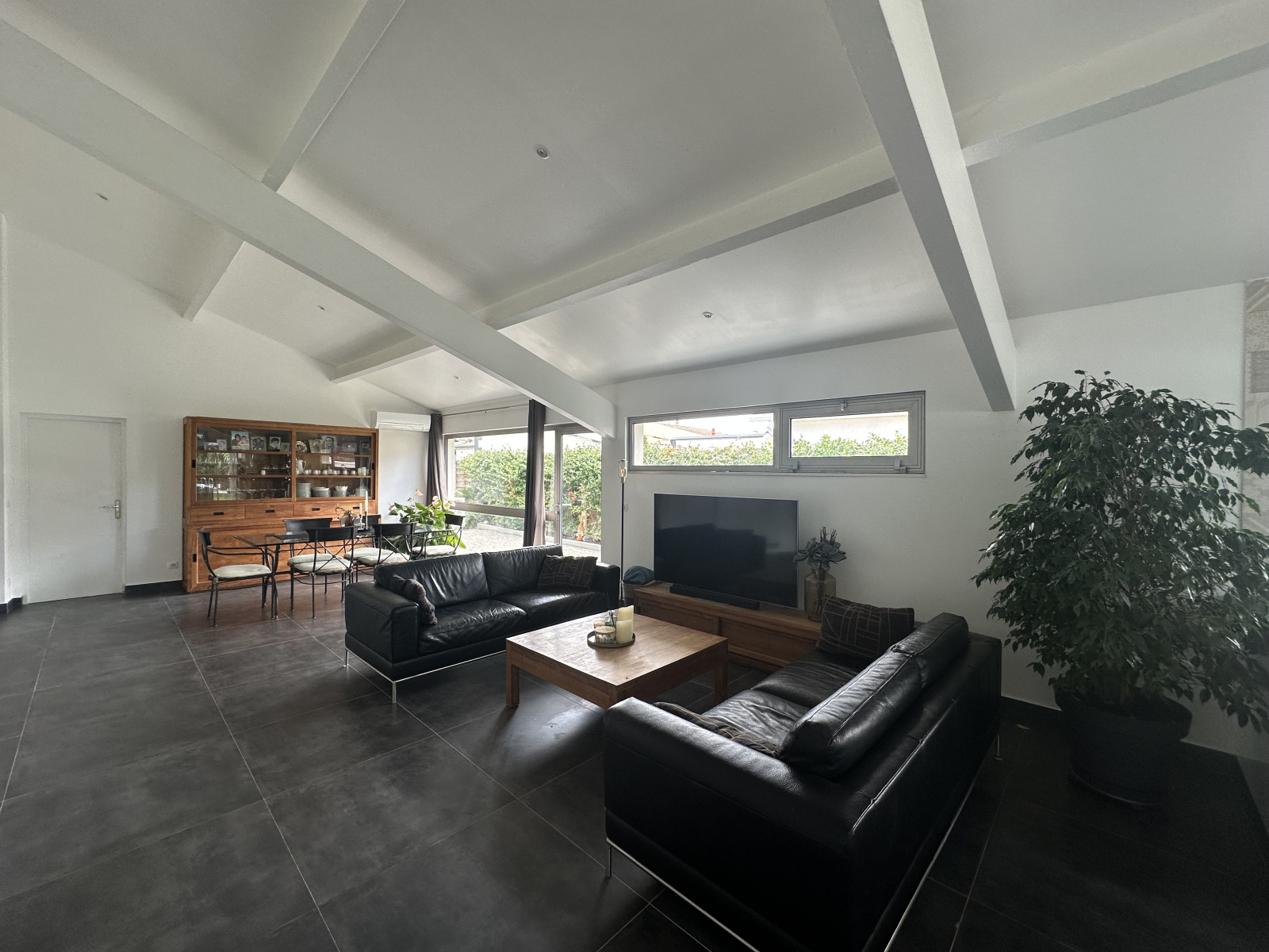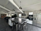 La pièce de vie d'environ 65m² est exposée sud-ouest et bénéficie d'un ensoleillement optimal. La cuisine familiale est totalement aménagée et équipée et s'ouvre sur une terrasse en bois avec vue sur la piscine.